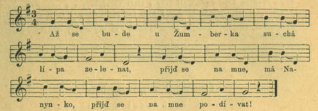Po tanci přiblíží se „táta", veda „mámu" pod paždím, k hospodáři, přeje mu dobrý večer a hledí při tom holí řádně ho „der-chnouti" neb aspoň spustí mu ji na nohu, až sebou škubne. Pak chorií spolu po světuici rozmlouvajíce žertovně o hospodářství, počasí atd. Zatím také „kubíci" hledí, kde možno, jaký žert provésti. Vůbec „kubíky" musí býti praví kubíci a řádní mluvkové. Kromě jiného také zjednává se „kubíček" u každého hospodáře do služby, při čemž „kmotr" dělá dohazovače a „táta" s „mámou" hledí ho spolu s „kmotrem" hodně vychváliti. Pak dostane už k vůli žertu všude zivdavek (čtyrák a p.), kteréžto peníze se pak společně propijí. Za nimi jdou 4 muzikanti; z těch každý měl své jméno, jaké, nemohl jsem vypátrati.