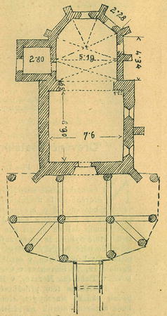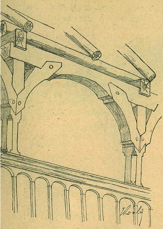 západním průčelí prostrannou předsíň. K zvonici vede přes příkop dřevěný krytý most. Kolem kostela je hřbitov, oUrazený prostým plotem. Zajímavá je zvonice ostře zakončená a dokladně sroubená z dubových trámů, kteréž jsou postaveny kosmo proti sobě a dosahují až po krov a rovněž jako střecha kostelní zvenčí až k zemi dolů šindelem jsou pobity. Pro jasnější názor, jak je střecha na okraji sroubená a jak vypadá úprava mostu dřevěného, podáváme náčrtky, které ve své mapě choval p. prof. J. Koula (viz obr. čís. 1. a 2.). Připojený půdorys (obraz číslo 3.)