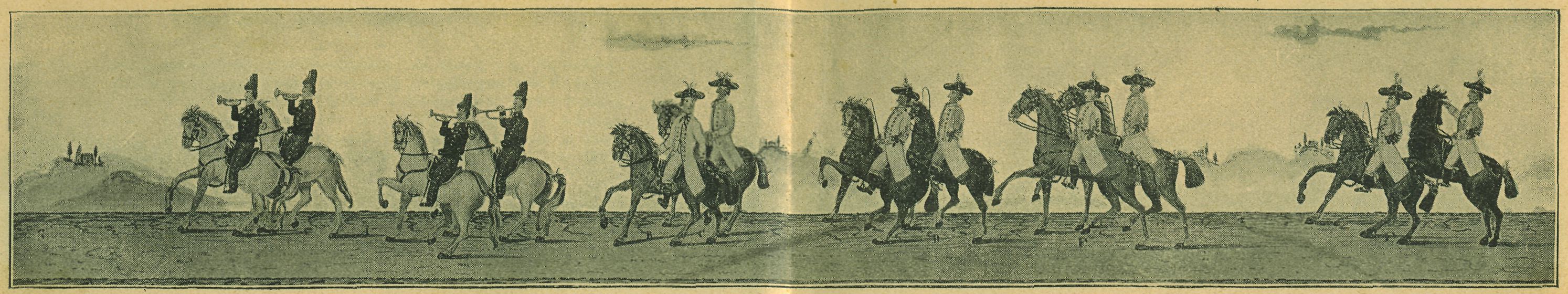„A. Čtyři trumpetrové, B. C Dva mužové z přátelstva ženichova. D. E. F. G. Ošum mládenců. H. Družba. J. Ženich. K. Dvě staré ženy vezou nevěstě klíče. L. Rychtář s jeho manželkou. M. Školní učitel s konšelem. N. 0. Deset holek z přátelstva nevěsty. P. Nevěsta se starou svatbí a dvěma družicoma. Q. Svadební blázen."