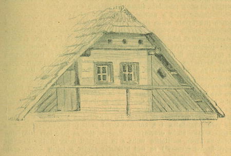 Dřevěný štít s pavlačí v Novém Postrekovš. Nakreslil F. Velc.
