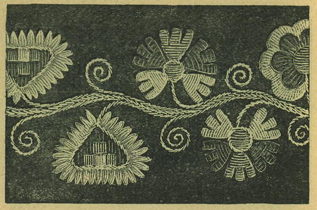 Čís. 20. Na tmavomodré půdě bílou (přízí), černou (vlnou), žlutou a zelenou (hedvábím).