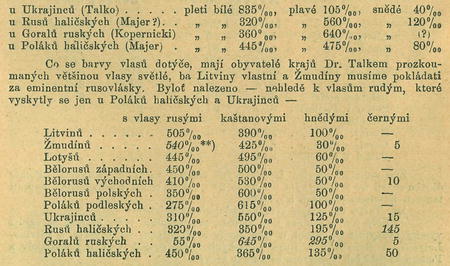 vlasy rusé, kaštanové, hnědé a černé (kromě toho rudé"), a to o sobě a v kombinacích. Práci uzavírá charakteristika hlavy, a to dle délky, šířky a obvodu hlavy, dle šířky a délky tváře, dle šířky čela a záhlaví (potylice) a dle tvaru nosu. Co do výšky tělesné rozeznává Dr. Talko muže malého vzrůstu (do 160 cm.), prostředního vzrůstu (160—170 cm) a velkého vzrůstu (více než 170 cm.) — ženy malé (do 144 cm.), prostřední (145—154 cm.) a velké (výše 154 cín ). Nejvíce velkých mužů nalezl Dr. Talko mezi Ukrajinci (34%) a vlastními Litvíny (27%); nejvíce malých mužů čítají Poláci halictí (36%) a Poláci pod-lesští (44%1; nejvíce velkých žen jest mezi Ukrajinkami (61%), Lotyškami (48°/0) a Polkami haličskými (43%)) nejvíce malých žen mezi Polkami podle-skými (14%).
