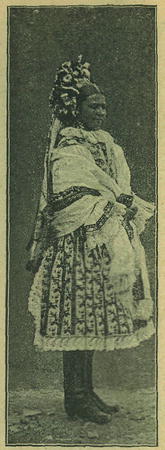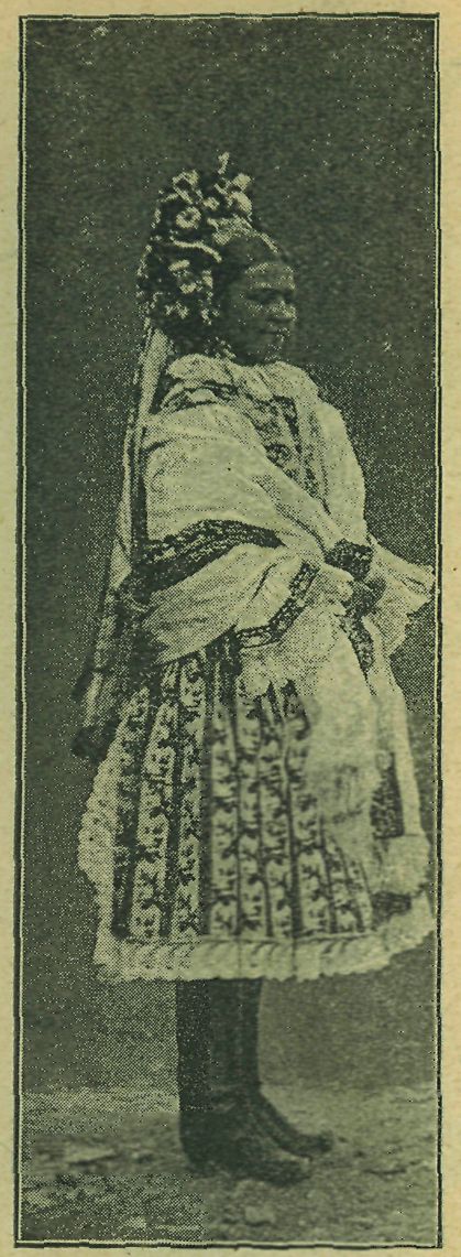 Neméně půvabné a skorém podobné je pentlení na Star. Hrozenkově, jen že tu, jak obr. na str. 428 ukazuje, vyšívaná „šatka" více ku platnosti přichází. Za ní je zase „parta"*) a při bedlivém prohlížení druhého obrázku nevěsty (na str. 429), zády obrácené, najdeme i dvě růžice „p o d-vazky" a špendlíkovou výzdobu nad pen-tlemi visutými. Místo listů a kvítí bývá tu juž v zádí hlavy tak zv. „tylo" z příční pentle široké mezi oběma „podvazky" a nad ním v oblouku zase (pod partou) červeně omotaný „vrkoč". Však i tu nad „tylo" kladou se zelené listy. Celek vrcholí pěkně korunkovitým věncem.