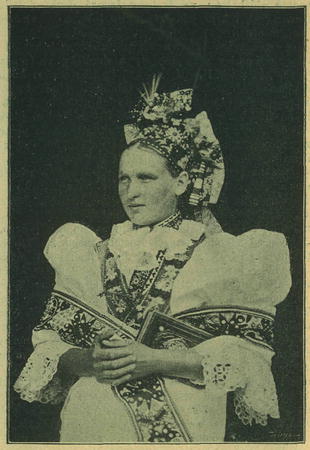 hlavy. Pak přijde nad čelo na vrkoč „věneček", nad uši „záušnice", jak připojí se „dénko" s „pantlama", pak „předkánka" (již po svatbě obdrží ženichův družba za službu prokázanou — přiseli se ženichem nevěstu vyptať!) a naposled připevní se „káuka". Že „vrkoče" nosívaly dívčice druhdy i mimo pentlení, víme z ústních zpráv i z písničky při čepeni nevěsty: