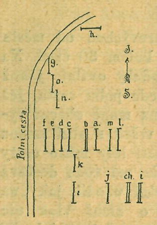 Na jaře r. 1894 na témž místě na pare. čís. 11 uhodili dělníci při zkopávání vršku na hroby se skrčenými kostrami, na pravém boku ležícími, kameny obloženými, hlavou k jihu, nohama k sev. Pokud možno, sestavena jest mapka pohřebiště podle výpovědi p. Václava Jindřicha, místního starosty a statkáře (jemuž autor tohoto článku za prokázanou ochotu srdečně děkuje).