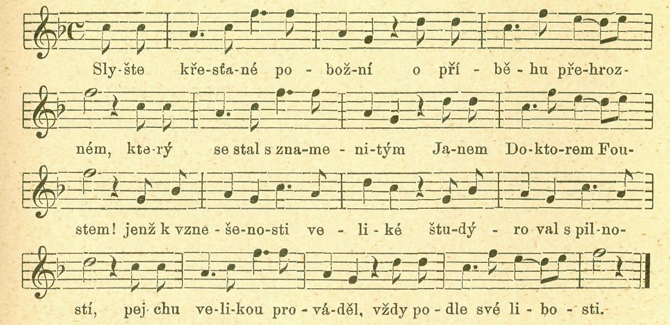 1. Slyšte křesťané pobožní, o příběhu přehrozném, který se stal s znamenití Janem Doktorem Foustei jenž k vznešenosti veliké študýroval s pilností, pejchu velikou prováděl vždy podle své libosti.