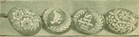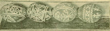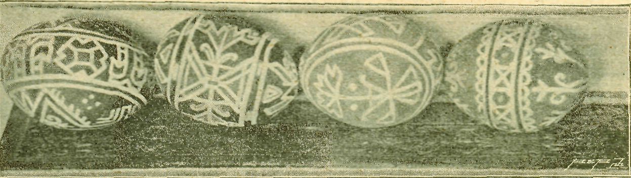 Na Uhersko-Hradištsku, hlavně však kolem Polešovic se nyní kraslice^velice dovedně tupým křivákem škrábou, čímž na červené, zřídka fialové půdě vzniká ornament sice méně rázovitý než tam, kde se pomocí vosku kraslice zdobí, ale přece ještě zajímavý. Kytice pěkně rozložené s přistínovanými lístky, větvičky palmové s holubicí nebo „nejsladším jménem Ježíš", ba i figury dosti realisticky podané vyskytují se velmi zhusta. A pak i nápisy různé na účel kraslice se vztahující. Jednou dostal se mi tak podivně psaný nápis do rukou, že věru jsem jej pokládal za kyrillský. Ale brzy přesvědčil jsem se, že to vše je znetvořené — i neznalostí — písmo tiskové. Uvádím tu maličkost se zřetelem k domnělým kyrillským nápisům na hanáckých úvodnicích moravských.
