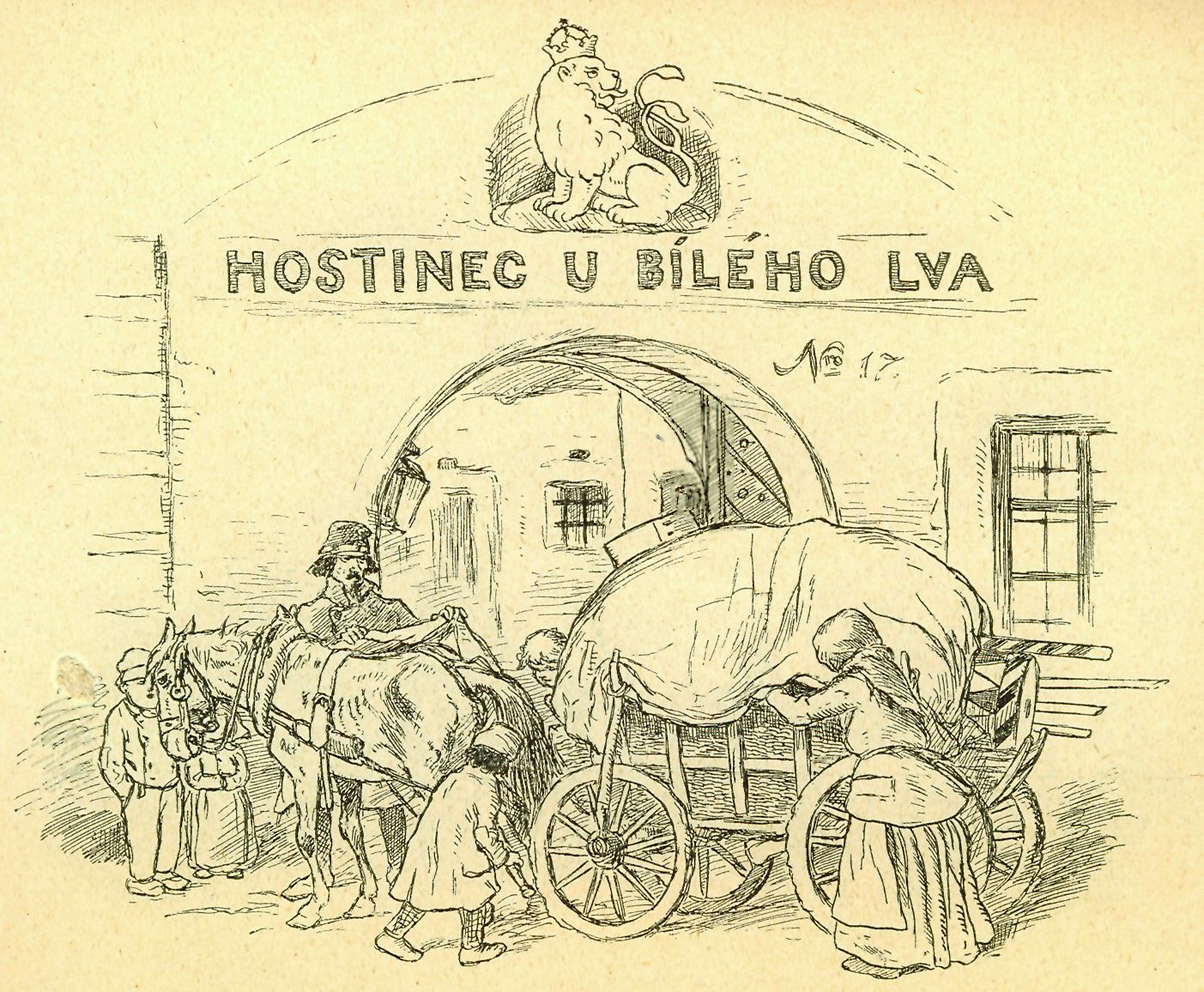 M. Kopecký přijel do zájezdního hostince. Kresba M. Alše.