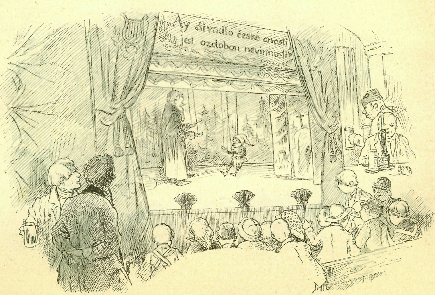 Loutkové divadlo M. Kopeckého. Kresba M. Alše