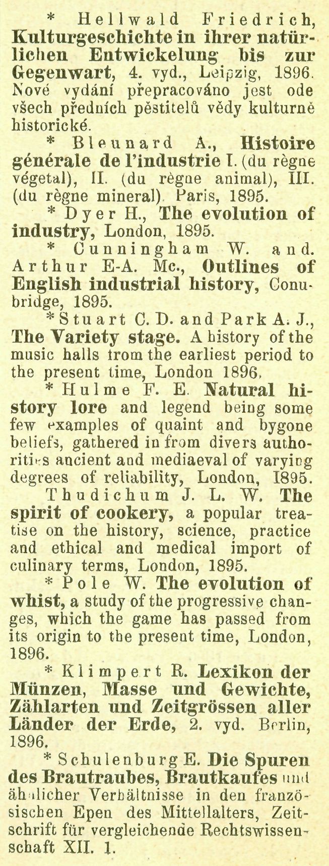 * Bunker J- R-. Das Bauernhaus in der Heanzerei (Westungarn), Otisk z Milth. Anthr. Ges., Wien, 1895 (se 102 vyobrazeními, půdorysy a pod.)- Práce důkladná, svědčící o znalosti moderních požadavků při studiu agrárně historickém. Přidávám na tomto místě přehled prací podobaých za poslední dobu, pokud ještě nebyly v Č. Lidu uvedeny: Petersen H-, Bygningslevninger af trae fra Danmarks tidlige middel-alder, Aarboger for nordisk oldkyn-dighed IX. 4. — J. B. Nordhoff, Das westfälische Bauernhaus, Wester-manns Mitth. 39, April. — 0. Monte-lius, Zur ältesten Geschichte des Wohnhauses in Europa, speziell im Norden, Archiv für Anthropologie 1895, 23. 3. — G. Baucalari, Thüring. Haustypen, Globus, sešit 67, obr. 22. — Týž, Das ländliche Wohnhaus der Schwaben und Bayern zwischen Donaueschingen und Regenoburg, tamtéž, sešij 68, str. 10. — J. Janko, A székely ház, Ethnographia (red. Dr. B. Muukácsi), Budapest 1896, VI. str. 1. — Hansen R., Die Bauern bäuser in Schleswig, Globus, 1896, 13, str. 201. Srv. literaturu uvedenou v C. Lidu V., č. 4, str. 384. Z listu prof. Dra. V. Nehringa z Vratislavě oznamuji, že spolek pro lidovědu slezskou zahájí v květnové schůzi rozhovor