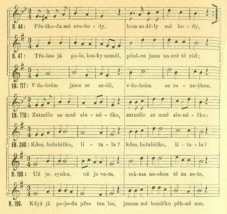 pětiřádkových zase Kdes, holubičko, lítala, jehož poslední řádka není třítaktová, jako první, nýbrž (patrně vlivem textu) jen dvoutaktová. Moravská píseň Ze země jsem vyšel od podaného zde
