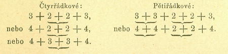 Při nápěvech čtyřřádkových shora otištěných činí výjimku toliko Ovčák pase ovce, jehož schéma taktové jest 3+ 3 + 2 + 3, při