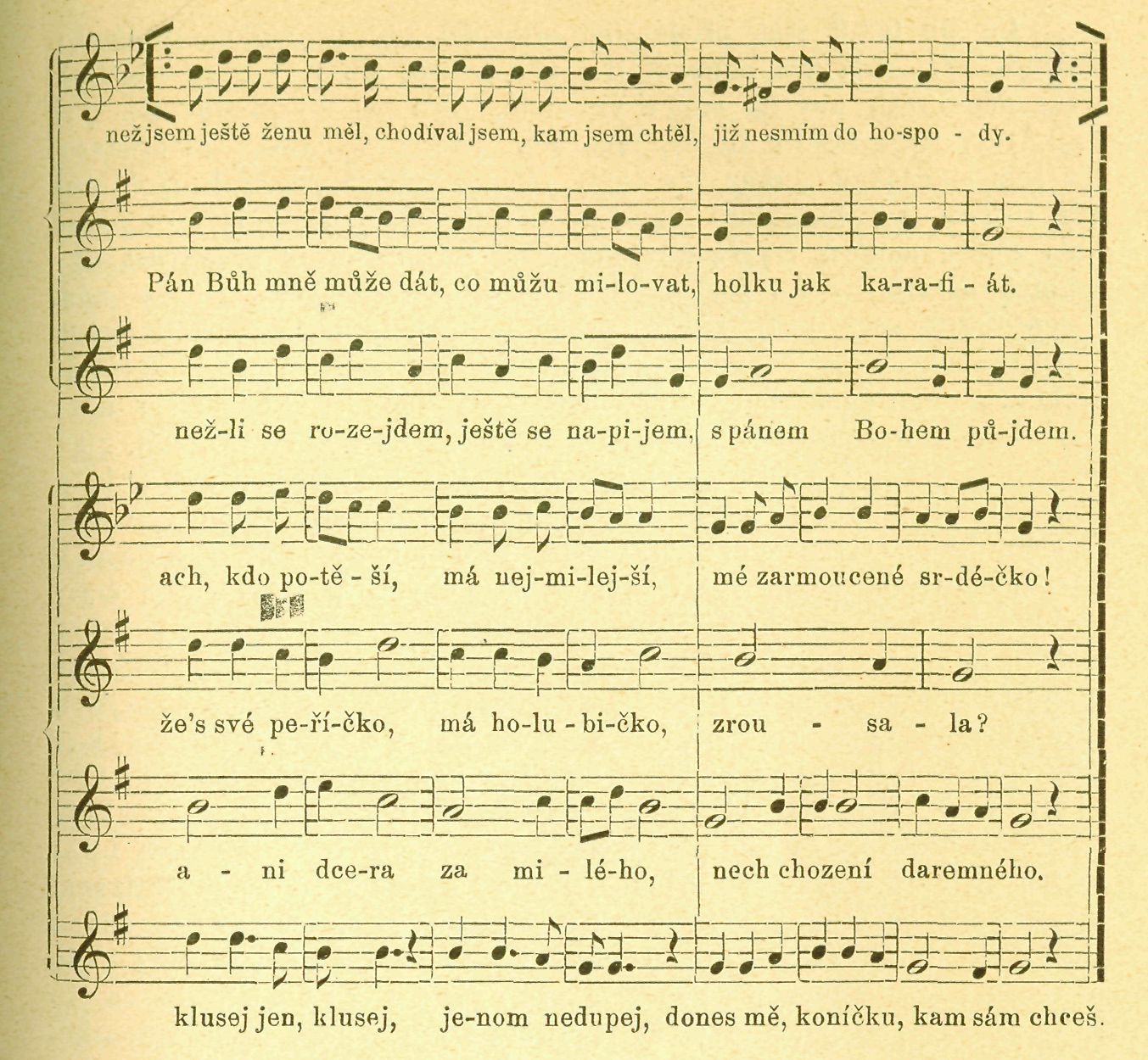 *) Měřím zde dle taktů a dle skupin jejich čili řádek hudebních nikoliv jen proto, že běží o stavbu celé, zpívané písně, nýbrž i z té příčiny, že verše textové a počet slabik v nich byly by základem nejistým. Rhythmieká a architektonická totožnost odpovídajících sobě na př. dvoutaktí (v příkladech přesně pod sebou vytištěných) je naprosto nepochybná, nechť dvoutaktí takové vyplněno jest veršem osmislabičným nebo třeba jen
