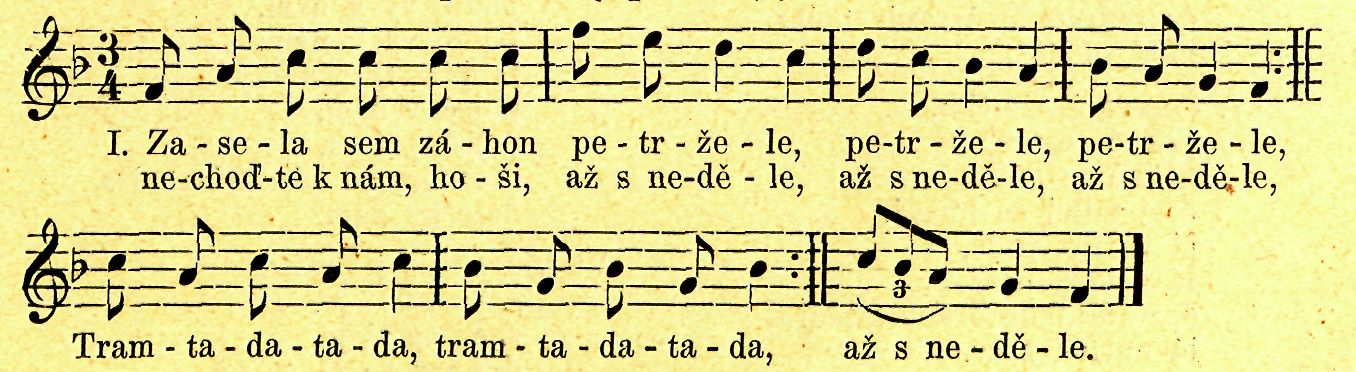 II. Záhon petržele, záhon mrkve, záhon mrkve, záhon mrkve, nechoďte k nám, hoši, až se smrkne, až se smrkne, až se smrkne, tramtadatada, tramtadatada, až se smrkne.