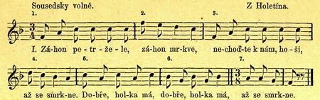 III. Záhon petržele, záhon vousa, nechoďte k nám, hoši, náš pes kousá. Dobře, holka má, dobře, holka má, náš pes kousá.