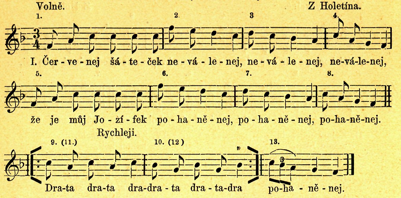 ,. pěkně se toč. Můj milej se hněvá, já nevím, proč, já nevím, proč, dratadratadradratadratadra, já nevím, proč.