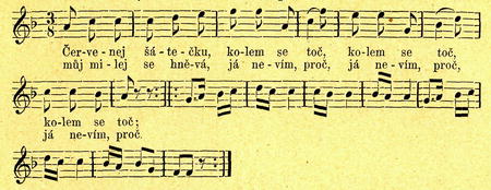 levicí svou si přidrží pravici tanečnice, tleskne třikrát svou pravicí na dlaň tanečnice. V taktu 6. tanečnice pravicí svou si přidrží levici tanečníkovu, tleskne třikrát svou levicí na dlaň tanečníkovu. V taktu 7. a 8. otočí se oba v levo.