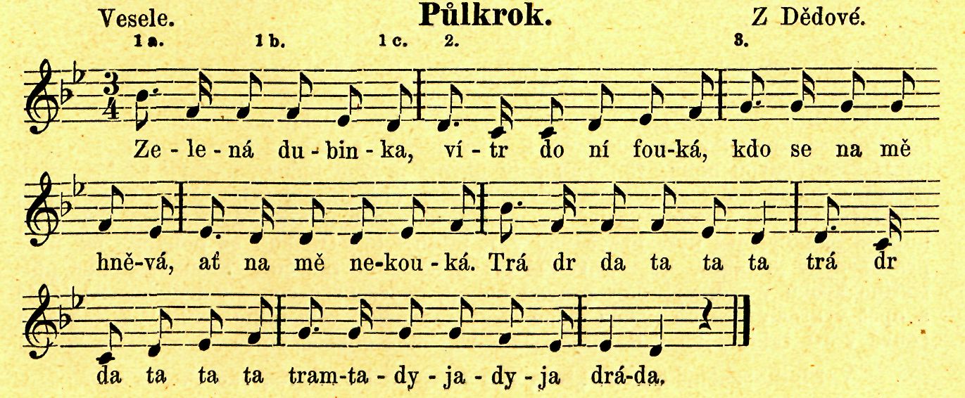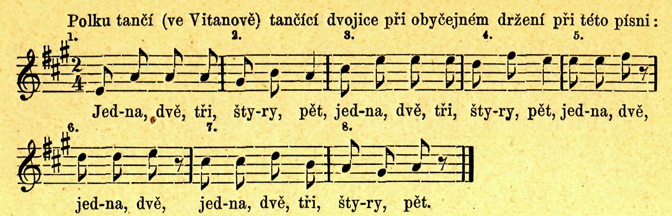 Tancují týž tanec tak, že v 1.—6. taktu tančí polku, v 7. a 8. taktu následuje otoč obkročákový.