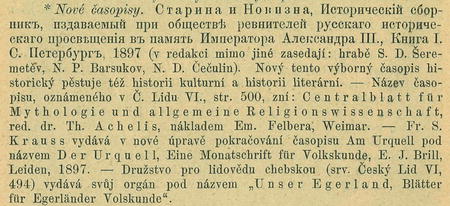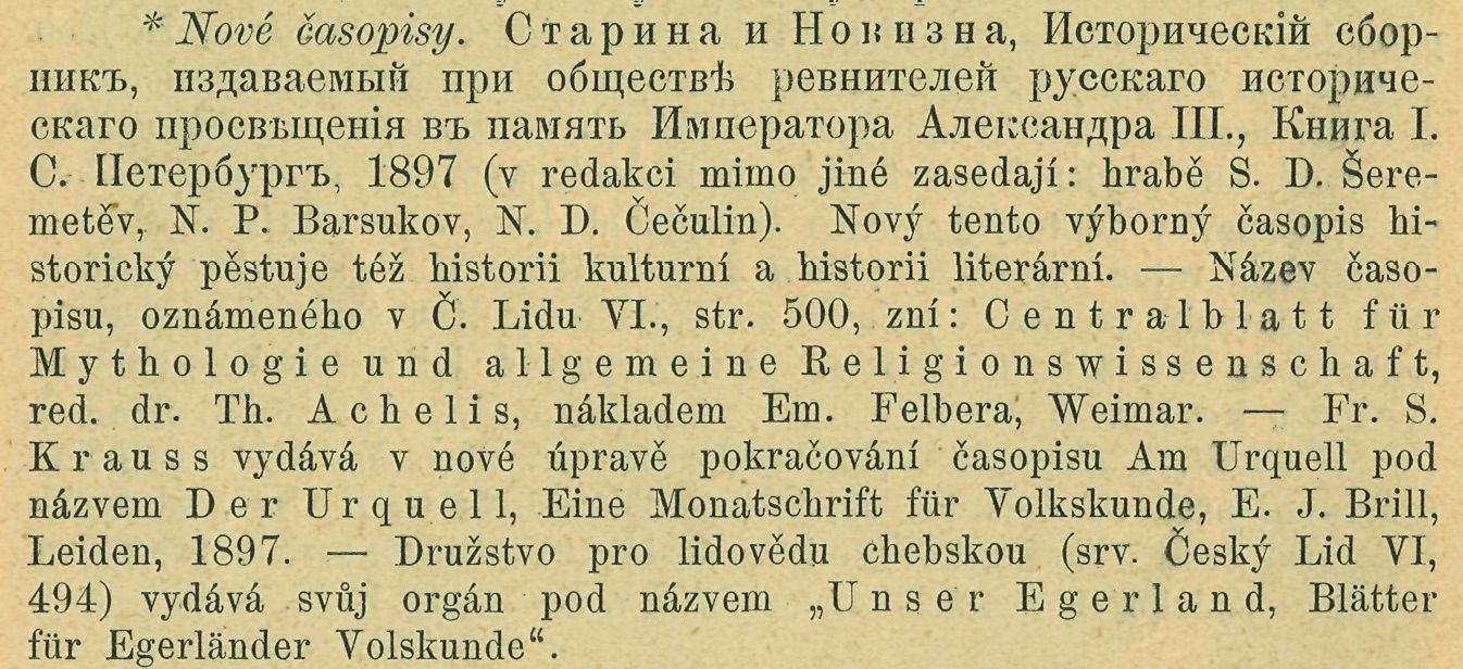 VI. 403) Národopisný Sborník Českoslovanský, redaktor prof. Dr. František Pa s-t r n e k, hlavní spolupracovník doc. dr. Em. Kovář, v Praze 1897 s tímto obsahem: Kovář E., Národopis a úkoly Národopisné Společnosti Českoslovanské; Tille V., Pohádky; Polívka J., Eybář a zlatá rybka; Vluka J., Ďadci čili hospodařící; Nie-derle L., Výběr vynikajících památek ze sbírek Národopisného Musea; Hostinský O., O prošodii a rhytmice českých písní lidových; Kovář E., Přehled dějin folkloristiky. Posudky a zprávy. Přehled časopisů. Bibliografie za rok 1895. Vzpomínky. — Společnost pro saskou