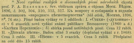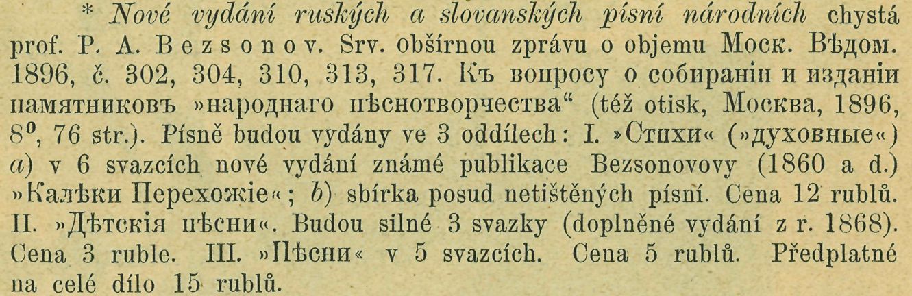 * Vydání úplné sbírky ruských národních gJeaseJc chystá horlivě ethnografické oddělení carského geografického družstva, jež zvolila k témuž úkolu zvláštní kommissi (předseda V. J. Lamanskij, sekretář P. M. Istomin). Sbírka bude obsahovati zkazky velikoruské, rnaloruské, běloruské a dodatky.