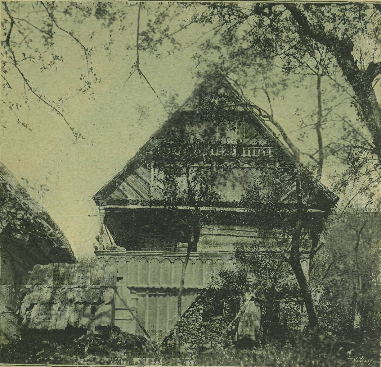 Stěží bylo zachytiti fotografický detail štítu, perspektivicky se svahu se zkracujícího; než obrázek zřetelně a věrně okazuje podrobnosti staré tesařské práce, zejména řadu kuželovitých sloupečků, ladně složených s vykrajovanými prkénky a lištami, červeně natřenými okraji a římsou označenou nápisem „Léta Páně 1807". Stavení toto zobrazeno a zařa-děno ve sbírce dřevěných budov ze severovýchodních Čech, vydaných tiskem r. 1895, kresbou J. P. Nicméně má poskytovati nynější fotografická reprodukce doklad staré vkusné řemeslné práce, pokud možná věrně dle skutečnosti, a zachytiti pro budoucno vzhled celku, než s něho po-nenáhlu zmizí pel původnosti a malebnosti. Jako budova tak i její ma-jetnici a obyvatelé staří manželé Rakoušovi, zasluhují býti uvedeni za vzor typicky českých, pracovitých, jednoduchých a při tom šťastných lidí, kteří povahami v ohledu národopisném liší se výhodně od novodobě stři-
