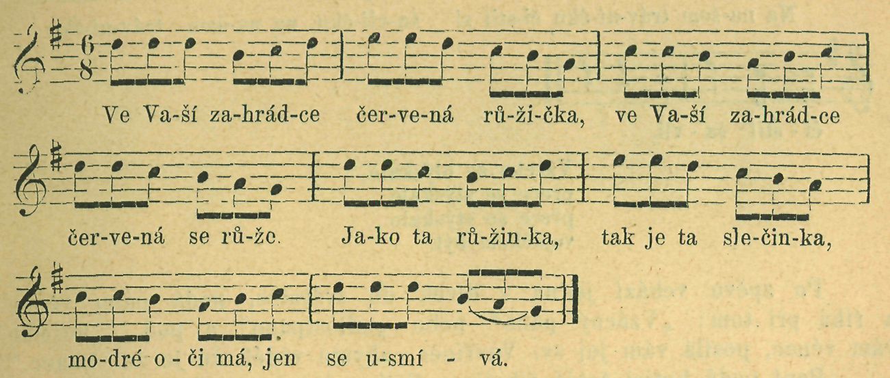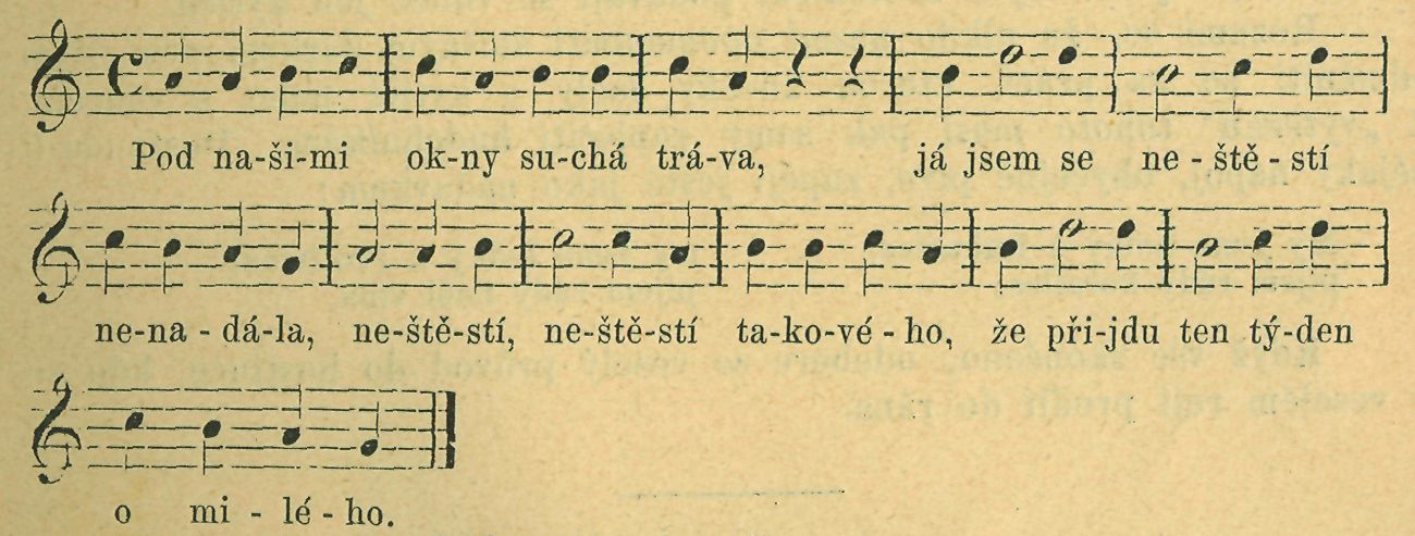 U nižších úředníků, obzvláště svobodných, pějí kromě některé písně se známým národním nápěvem — ale „improvisovanými" verši, též jiné, jako: