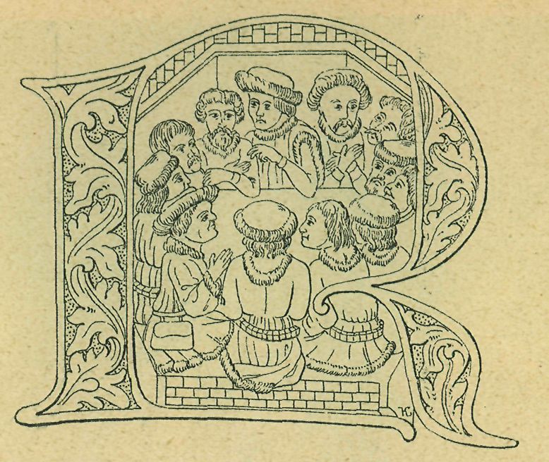 obrázku podaný jest „poslední Mohykán". Potud prof. J. Klvaňa (Světozor 1895, str. 24). Dodáváme tu, že je zajímavo srovnati podobu tohoto kožichu s vyobrazením kožichů, jakými jsou oděni sedláci moravští v rukopise městského archivu brněnského, v Kodexu Wenceslai Notarii. Viz Zíbrt, Dějiny kroje v zemích českých, v Praze, 1892, I. 326—327. Kukopis pochází ze století XV., avšak snadno se dohodneme, že při houževnatosti prostého lidu, zejména v dědinách moravských, které nebyly tak účinně zasaženy vlivem mody cizí, stará podoba kožichu z věku XIV. a věků předchozích udržuje se se všemi rázovitými znaky lidovým podáním ve století XV. Usuzujeme, že kožichy, jimiž sedláci při poradě na obrázku jsou oděni, věrně jsou vyobrazeny podle skutečnosti. Vždyť se snažil malíř zachytiti na kresbě i zevnějšek tváře, úpravy kštice, podobu čepice, lemované beránkem a patrně tedy také kožichy pokusil se znázorniti věrně podle skutečnosti. (Viz připoj, vyobr)