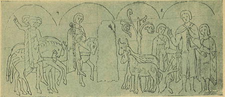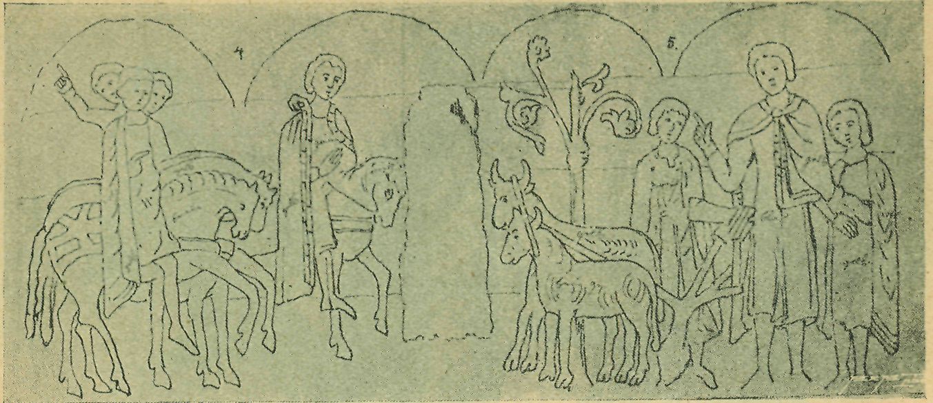 čís. 1. Libušino poselstvo u Přemysla Oráče. Nástěnná malba v románské hradní kapli z XII. stol. ve Znojmě.