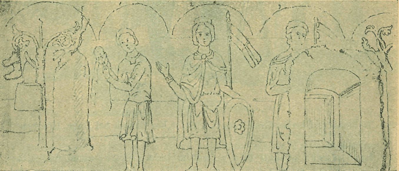 čís. 2. Libušino poselstvo u Přemysla Oráíe. Nástěnná malba v románské hradní kapli z XII. stol. ve Znojmě.