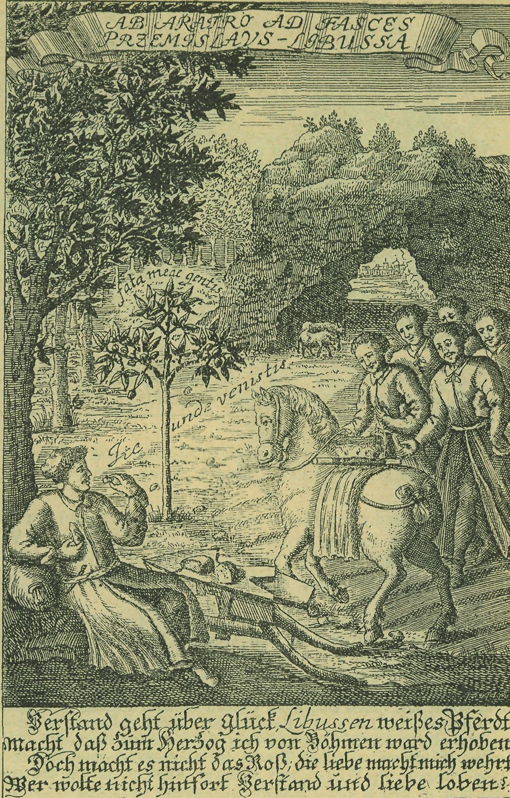 str. 241). Třetí vyobrazení, jak poslové Libušini se zdvořilými ukłonami zvou obědvajícího Přemysla na prestol knížecí, vybíráme z titulního listu knihy: (Henr. Ludw. G-ude), Staat von Böhmen, Halle, 1707; srv. pověst tamtéž na str. 14—15 (vyobr. č. 4.). Dr. Č. Zíbrt.