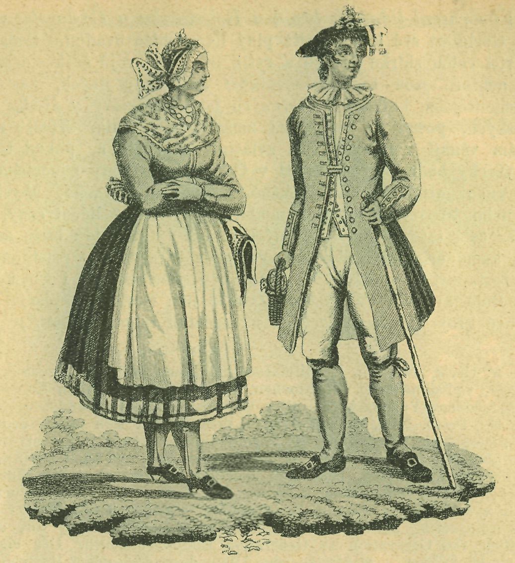 schlagen. Die Strümpfe sind meistens bunt, mit Zwickeln von anderer Farbe, und am Fusse sitzt entweder ein Schuh mit Schnalle, oder klappt auch nur der Pantoffel mit zierlich buntem Absatz daran. Zum vollen Anzug gehört noch eine seidene Schürtze und über das Mieder ein Corset mit rundem Hängekragen (oft mit Pelzwerk verbrämt) und zahlreich gefalteten Schösschen oberhalb der Hüfte, und wird über Land gegangen, so bedecken sie die Köpfe mit grossen Tüchern, meist von gedruckten Cattun. Das Corset und runde Häubchen war sonst auch die gewöhnliche Tracht der Bürgerfrauen und ihrer Töchter in den Städten und selbst in der Hauptstadt, wo man jetzt nur selten noch eine Spur dieser Kleidungsart findet, etwa die Mägde ausgenommen, welche vom Land in Stadtdienste genommen werden. Die Kleidung der Bewohner von Tauss ist zum Theil schwarz und bildet recht wohl. Die Bauern im Egerschen Bezirk, welche ebenfalls schwarze und dunkle Gewänder lieben, tragen sehr grosse runde Hüte, die breiten Krampen etwas herabhangend, weite, kurze Hosen, die ziemlich hoch an die Brust reichen, und breite Hosenträger. Gegen das Riesengebirge findet man noch häufig kleine dreieckige Hüte, blaue Röcke mit grossen Taschen und lange Westen, und an den Hauben der Frauen breite Blenden von ordinären Spitzen." Dr. Čeněk Zíbrt.