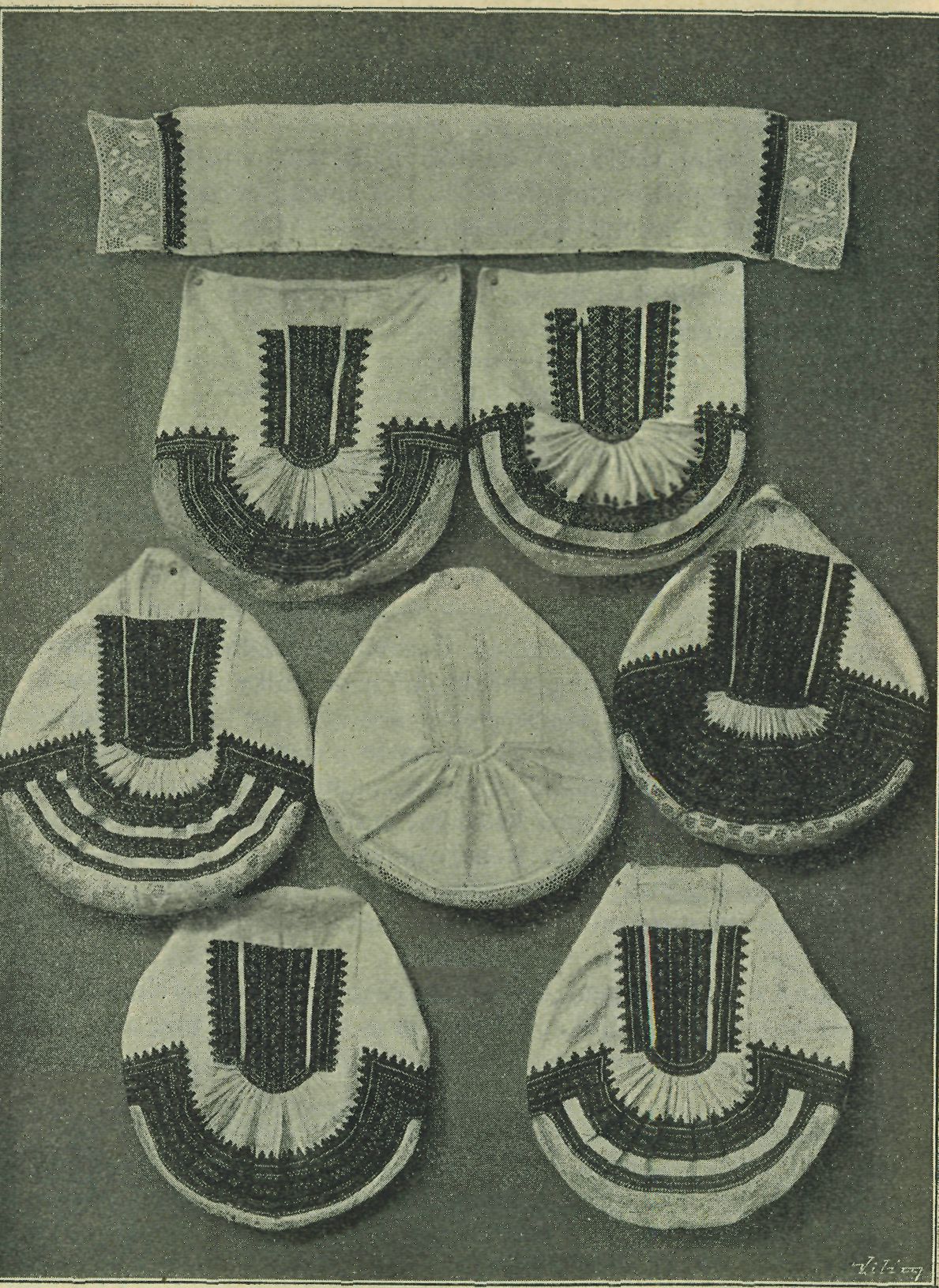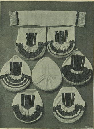 dole zadu, na dva palce tlustý, ke koncům vytracený a celý bývá ještě poiit neb otočen bílou látkou. Čepec takto napjatý a tkaničkou stáhnutý žena ještě plínkou podél více než na půl přeloženou k čelu a skráním uvazuje a dole zadu pod „čampulí" zavazuje. Čepce bývají bohatě, oby-