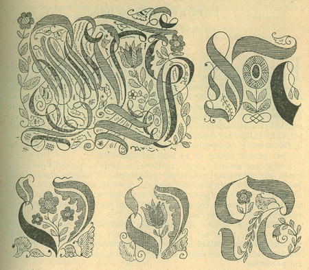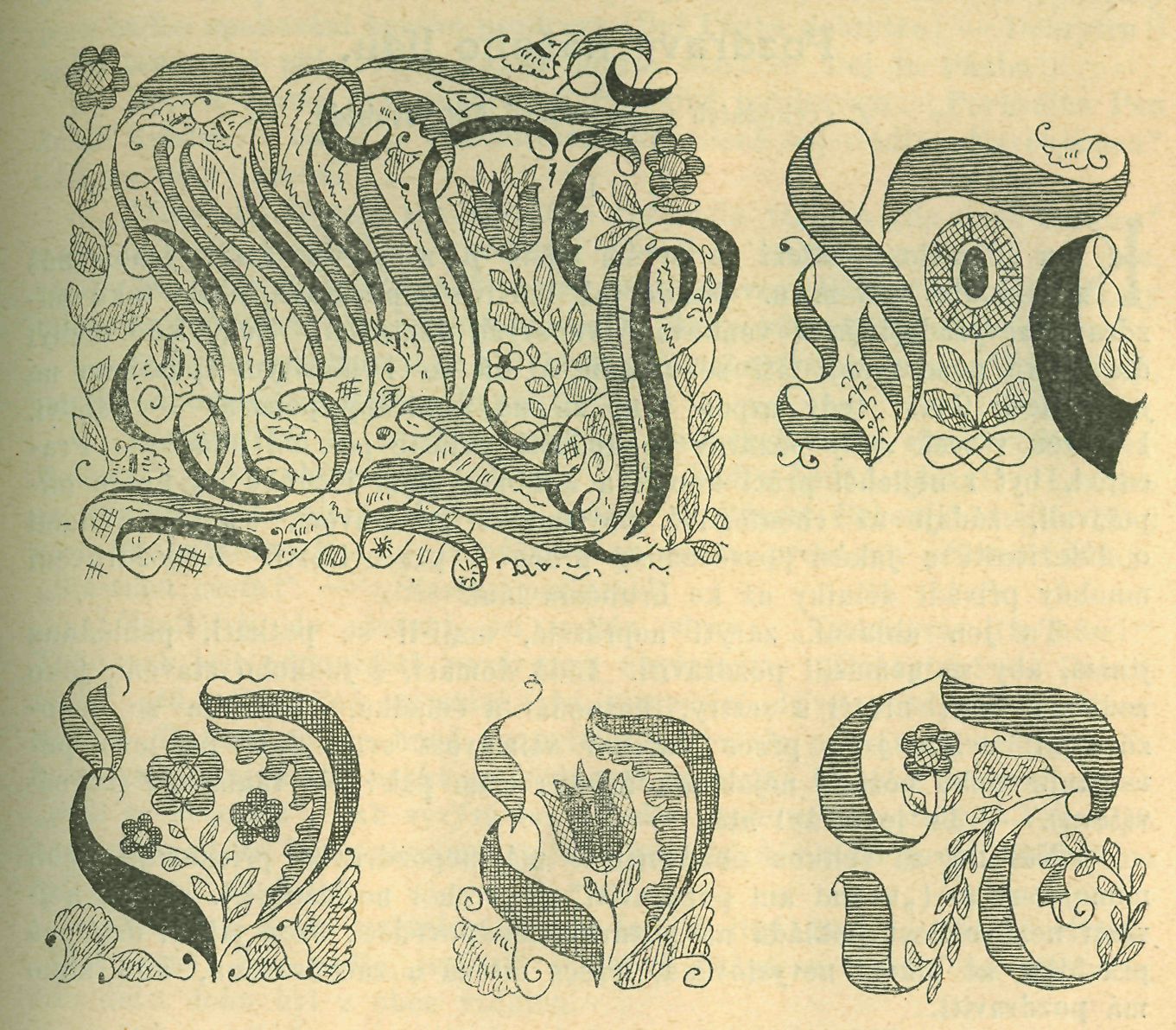 Bohatostí motivů nevynikají, opakuje se pouze: tulipán, pěti-a šestilistý kvítek a jiný slunečnici podobný, kromě těchto pak ještě žalud (vyskytuje se jen třikráte), zcela tak kopírovaný, jako jej na kartách vidíme. Velice hojně a dovedně užito jediného ornamentálního motivu (užitého na proužku před článkem), který na každém téměř písmeně je uveden a různě dle místa se přizpůsobuje. Motiv tento upomína základem na pěkné lemovky na starých loktuškách zdejšího kraje se vyskytující, podobně i květy.