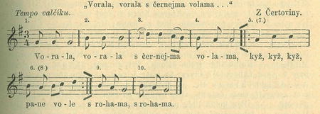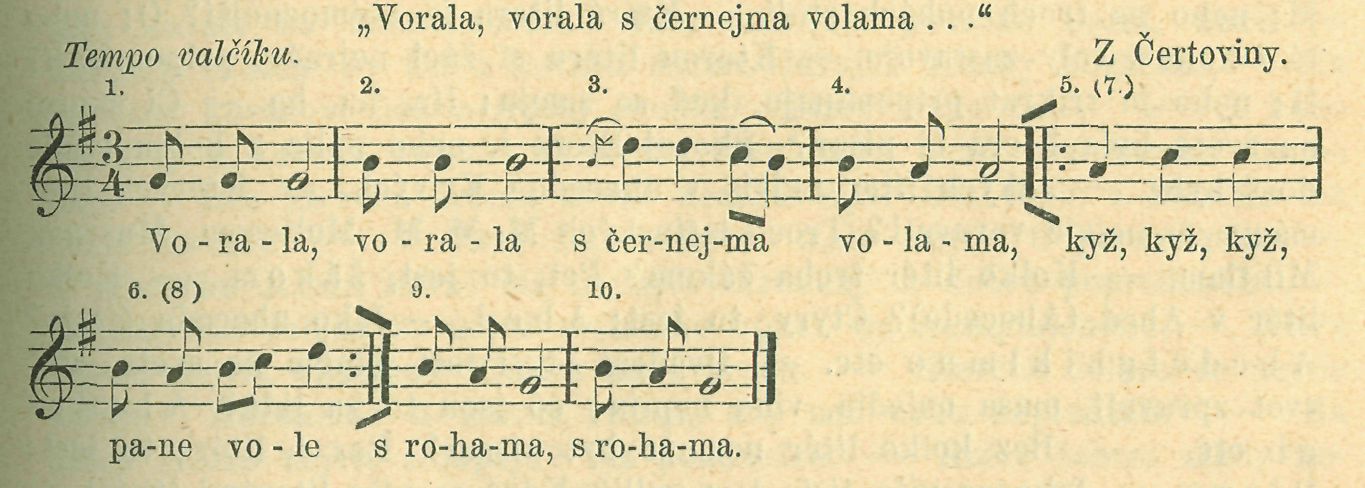 Tanec kolový. Tanečník stojí proti tanečnici a drží cípy svého kabátu rozpažmo, tanečnice drží cípy fěrtochu. Na (1.) lehký houpavý úferok vpravo a šou-pavý sun, pak dva potřesy pravou nohou na místě; tanečnice dělá totéž ve stejnou stranu stejnojmennou nohou (tedy opačné pohyby), (2.) lehký úkrok houpavý v levo, šoupavý sun, pak dva potřesy levou nohou na místě, tanečnice dělá totéž ve stejnou stranu stejnojmennou nohou (tedy opačne' pohyby), (3. 4) otoč (valčík) na pravo, (5 ) = (1.), (6.) = (2), (7.) = (1.) s poklonou v pravo, (8 ) = (2.) s poklonou v levo. Tanec znova.