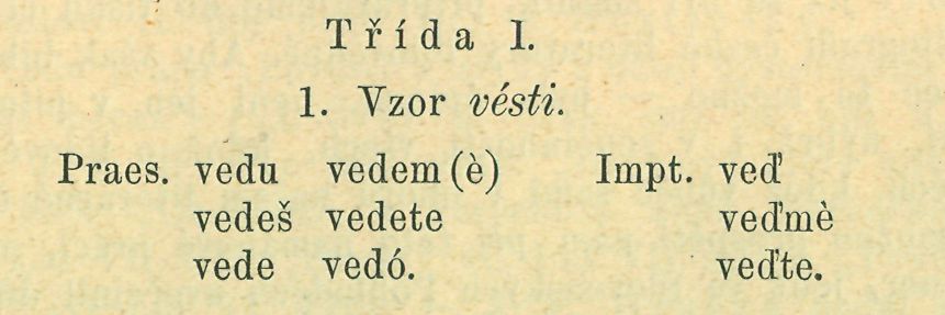 Tvary praesentní. 1. u, ú v 1. sg. a 3. pl. se nepřehlasuje: I. 6. melu, melo, I. 7. krěju, krějó, III. l.umijó, III. 2. trpijó, IV. pro-sijó, V. la děíajó, vedle toho v této třídě bývají i tvary přehlasované : dětaji, řikaji atd. V. lb sázijó, V. 2. tešu, tešó, V. 4. hraju, hrajó, VI. kupujú, kupujó. 2. 1. osoba plur.; ? (?) se odsouvá u těch sloves, které mají v 1. sg. -u: vědem, nesem, kréjem, hrajem, kupujem Někdy i v těchto případech ? zůstává: vedeme. 3. 3. plur. ú se mění v ó: vedó atd. U sloves III. a IV. tř. a u některých bezpříznakých se tvoří