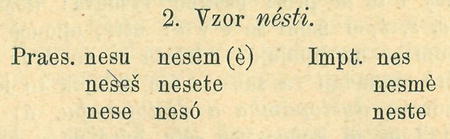 Inf.: nysť, přech.: nesa, Part. -1: nesl. Slovesa nésti a vésti mají v Part. -nav Subst. verb. nešeně, vežene; neseni, vezeni analogií dle vz. prositi. (Pokračováni.)