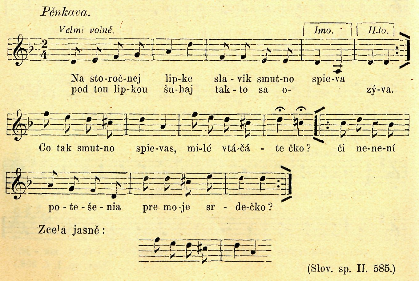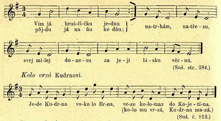 Hrušky padajíce rupotají. Ohasník přemýšlí, co by tak přinesl svojí nejmilejší. •— Ví kdesi o jedné hrušce, půjde „na ňu ke dňu", natřese a donese jí. V duchu již se vidí na stromě, slyší, jak hrušky padajíce na zem klupotají, a co tak myslí na děvče a na hrušky, již se v něm krystalisují slova s nápěvem: