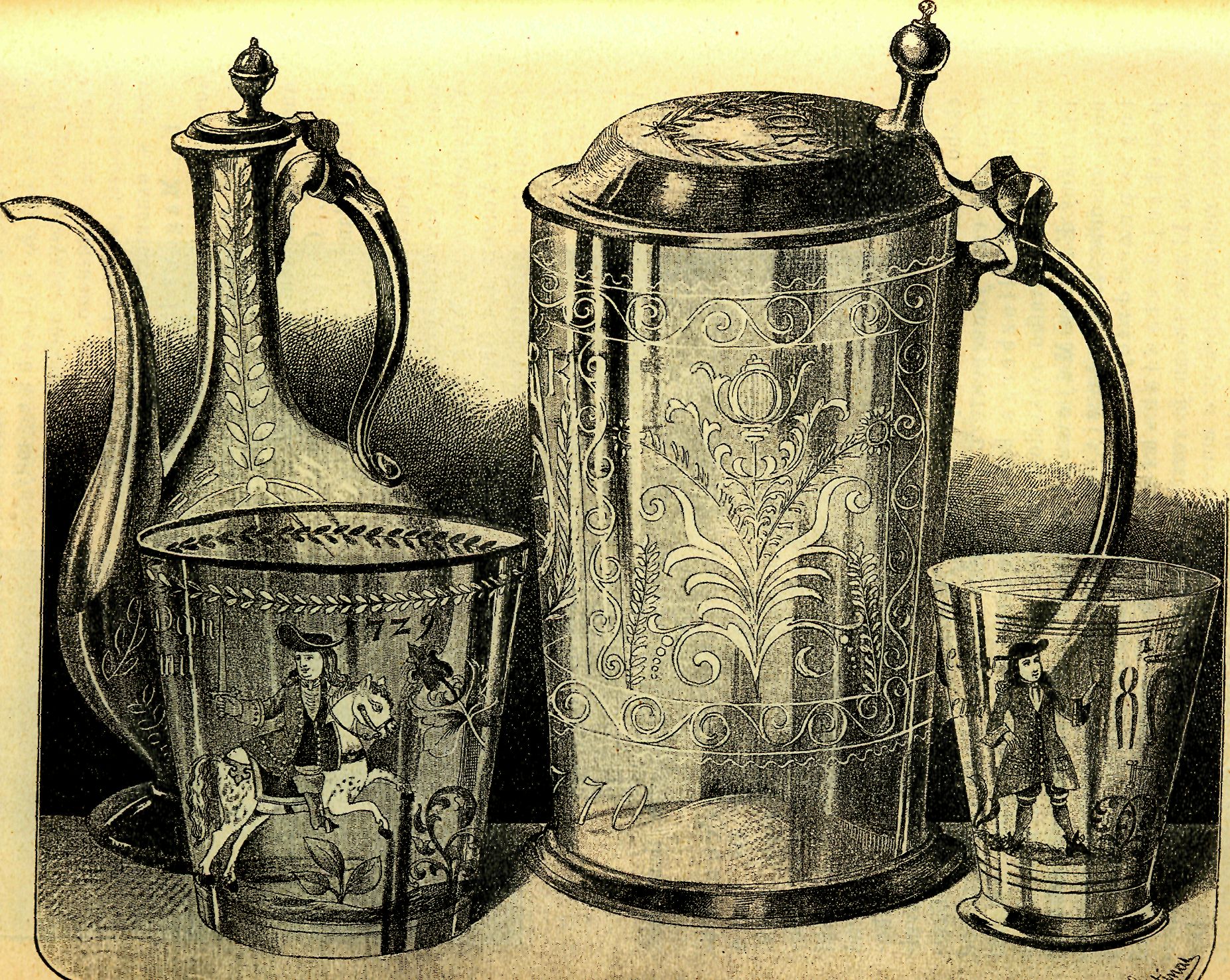 Z Náprstkova Musea: V levo sklenice malovaná s nápisem: Pán Bůh mnoho darů má, komu ráčí, tomu dá.
