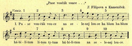 Tanec kolový. Dvojice se postaví jako ? tanci vůbec, a tančí v taktu 1.— 4. do kola polku, načež v taktu 5. tanečník poskočí dvakrát na levé noze,