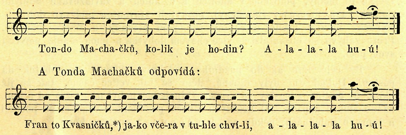 Se stráně na stráň, kam roklemi a úžlabími byla cesta daleká, dorozumívali se skotáci hravě. Kozmlouvali zpívajíce a každá otázka i odpověď končila zavýsknutím: alalala huú!