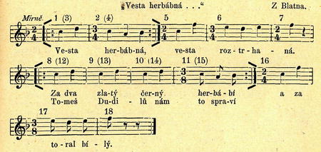 Tanec kolový. 1.—4. polka, 5. tanečník potřese na místě dvakrát levou nohou, tanečnice učiní tak pravou nohou, 6. tanečník pravou nohou, tanečnice levou nohou a 7.-8. pak se oba otočí obkročákem. Tanec znova.