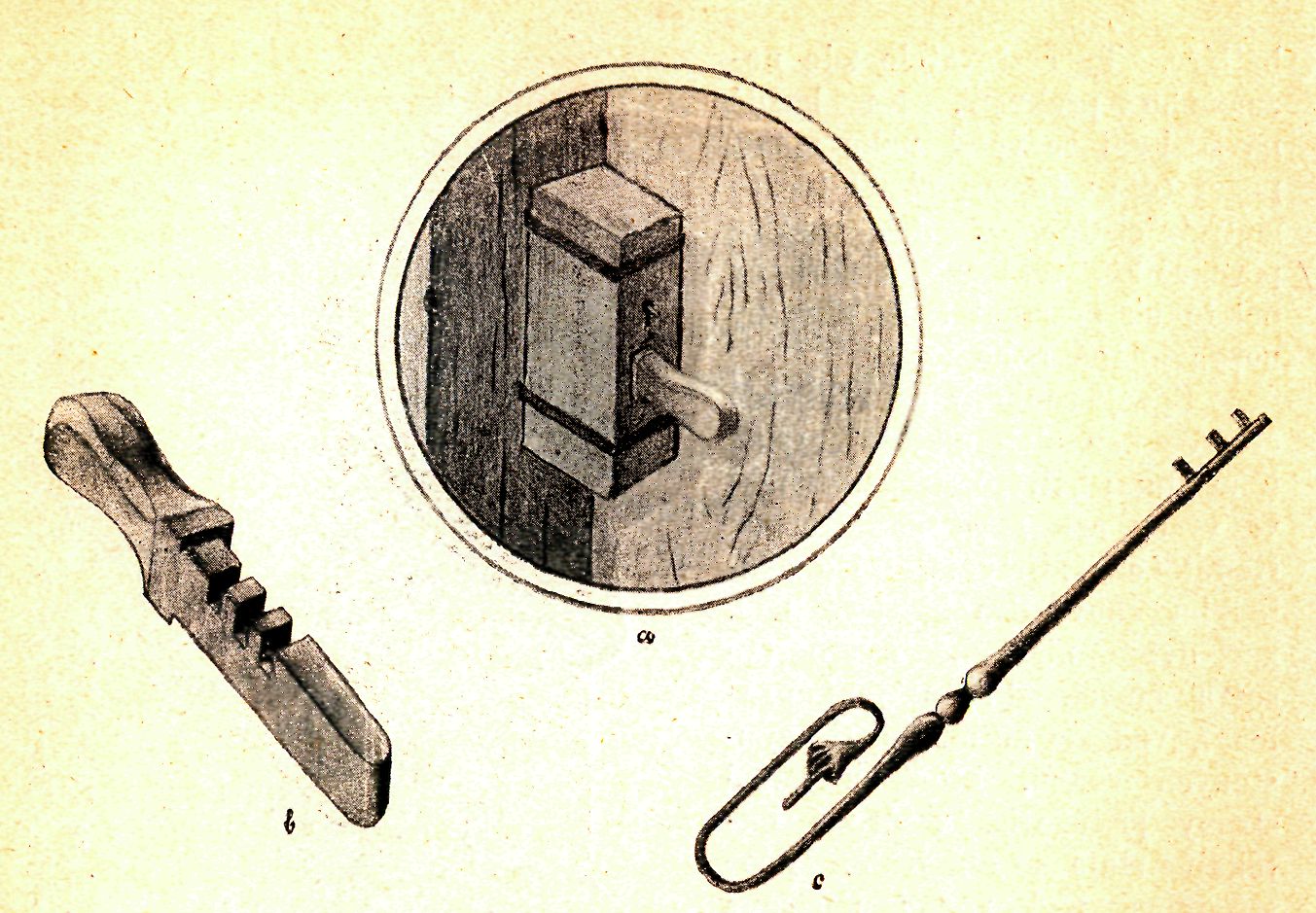 Čís. 2. a) Dřevěný zámek u haltýře. b) Hevlata. c) Klíč, „klika" k tomuto zámku. Kreslil Jar. M a n č a 1.