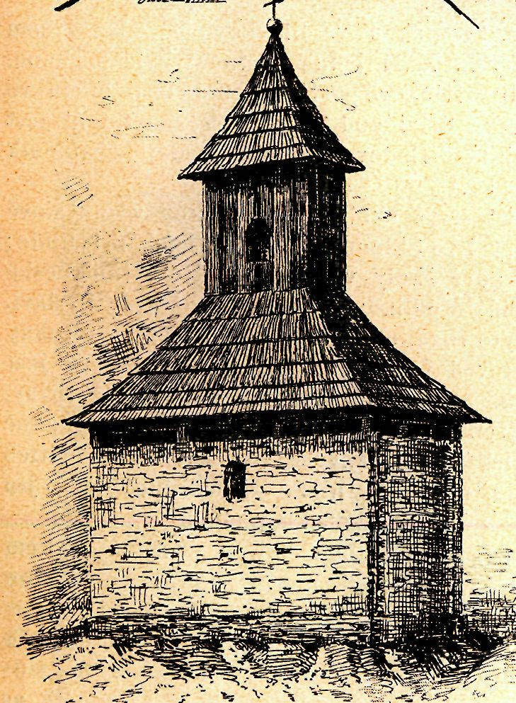 Stavba spodní jest zděná se značně povznesenou střechou; na jejím nižším, je-hlancovitém zakončení vystupuje věžička na čtyřech sloupcích oblouky vespolek spojených spočívající a zakončená opětovně přiměřenou bání neb jehlánkem s makovicí "a křížkem. Celek má zjev velmi úhledné kapličky, zdobící náves. Pěkný příklad tohoto slohu jest v Křídlech, jiný v Maršovicích, Pohledci, Samozíně a j. (Čís. 11.)