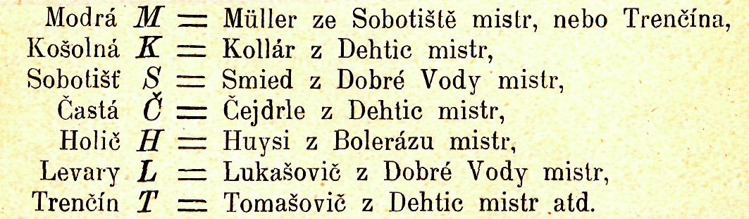 Řidčeji, ba velmi zřídka objevují se značky na nádobách z Dehtic a Dobré Vody pocházejících. — Stupava má St, Levary L, Košolná K, Modrá M atd.