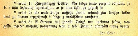 váli. Od dětských let se milovali, beze všech překážek záhy svatbu slavili a svorně, v lásce žili s četnou rodinou do 70 let, potom brzo za sebou zemřeli. Jan prý býval písařem dobrým; dopisy své a tedy i dopis tento dle domnění potomku, kteří list na památku uchovali, vyhotovil a psal sám Druhý dopis přátelský a spolu milostný je prostší, bez malované okrasy, jen vypichováním ozdoben. Také toho listu základem jest čtverec (37 cm. na dél a šíř), jenž byl složen v osm trojúhelníku; trojúhelníky však jsou na volných krajích zastřiženy v oblouky, které jsou drobnými, tupými zoubky nepravidelně zoubkovány. Tyto zoubky okrajní jsou vyplněny souvislými obloučky vypichovanými a mezery mezi obloučky přikrášleny jsou hvězdičkami. Na prostoře mezi tou krajovou ozdobou a dvojnásobnou .řádkou bodů, ke středu dopisu obloučky a hvězdičkami prizdobenou, vypíchány obrysy postiliona, an jede na voze, ? němuž kůň jest připřažen. Před tím stojí stromek. Kůň s řemením i starodávný poštovský vůz s vozkou na kozlíku vypíchány jsou z části z rubu na líc, z části naopak, aby co možná činily dojem pla3tický: vozka totiž, přední strana koně a vnější obrysy vozu vypíchány z rubu na líc, zadní nohy koně, postroj koňský, voj, bič vozkův vypíchány z líce na rub, čímž ony části jeví se silnějšími a bližšími, tyto naopak slabšími, po případě vzdálenějšími. (Arci tím, že všecko propichování provedeno, když list v trojúhelníky byl složen, jest jenom na trojúhelnících jedněch (na př«osmina 1., 3., 5., a 7.) směr pichů, jak tu vylíčeno, na ostatních jest poměr obrácený.) Střed listu upraven je takto: čtyři srdce větší, v něž potom vepsán byl dopis, obklopena jsou vždy dvěma delšími větévkami s četnými výhonky a s kvítky po koncích výhonků, větévky vyrůstají z menších srdéček na 1 cm. od prostředka listu umístěných. Ze srdéček větších vynikají větvičky kratší také s kvítky a listy, mezi nimi pak napsány jsou číslice (1—4), označující počátek a pokračování dopisu. Větší srdce jsou ohraničena trojnásobnou řadou propichování, z nichž obě krajní řady mají pichy směrem souhlasným, prostřední řada směrem opačným. Větévky i výhonky vytvořuje jednoduchá řada pichů, ale kvítka zase vypíchána jsou směrem opačným.