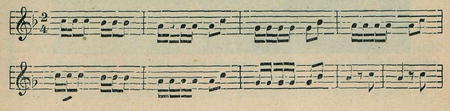 Ruce křižmo couvá tanečnice pozpátku krokem proměnným — pustí se, poskočí pravou nohou vpřed, levou postaví vzad; otáčka v závěsu vpravo, zase poskok, otáčka vlevo a opět poskok.