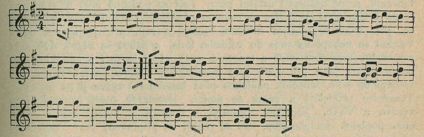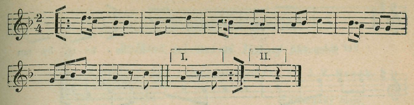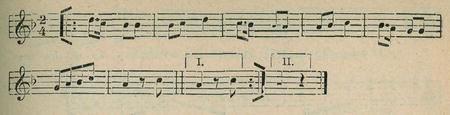 Polka. Zastaví se. — Poklony. Obrátí se páry a učiní poklonu ocí sebe. Opakuje se.