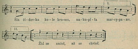 Počíná polkou. Tanečníci obráceni k sobě zadupají a zatleskají třikrát; pohrozí si pravým, pak levým ukazováčkem a otočí se porůznu. Dupání, tleskání a přihrožování, také otáčka se opakují. Polka.