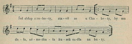 Tanec tenlo skládá se z libovolných figur, jaké ukazuje některý 'tanečník, jehož následují ostatní páry. Točí se podobně jako u »taňca« •(číslo I. této sbírky); držíce se rukama popocbázejí třemi kroky, odchylují se, pak třemi zpátečními kratšími kroky couvají, přichylujíce se něco. Všichni se uchopí za ruce do velikého kola, z něhož se utvoří dvě kola soustřední (tanečnice vnitř a tanečníci vně), která se točí a provádějí podobné figury jako při šesté túře čtverylkové. Končí takto: První pár vstoupí do kola, tanečník poklekne před tanečnici a vyzve ji na hubičku. "Tanečnice přiklekne a párek se políbí. Povstavše otočí se podpažmo vpravo a vlevo. Tanečník vystoupí z řady a z tance vůbec, zanedbav poplatek hudebníkům, což se položí na připravený talíř. Tanečnice vyzve poklonou tanečníka z kola na hubičku, což se zase odčiní, jak po-vědíno. Takto se vystřídají páry. Je-li mnoho tanečníků, dá pořadatel tance hudebníkům znamení, aby zahráli polku, čímž ukončí poslední páry tanec.