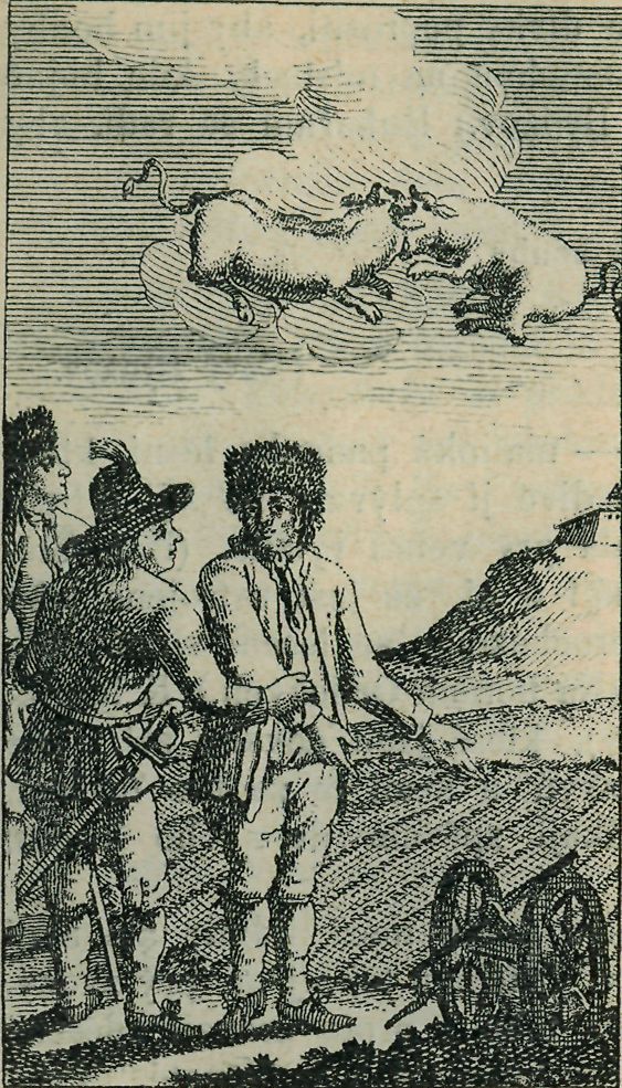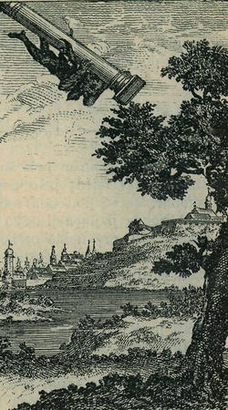 Č. 2. Čert nese sloup z Říma na Vyšehrad. Pražská pověst. Rytioa z r. 1787.